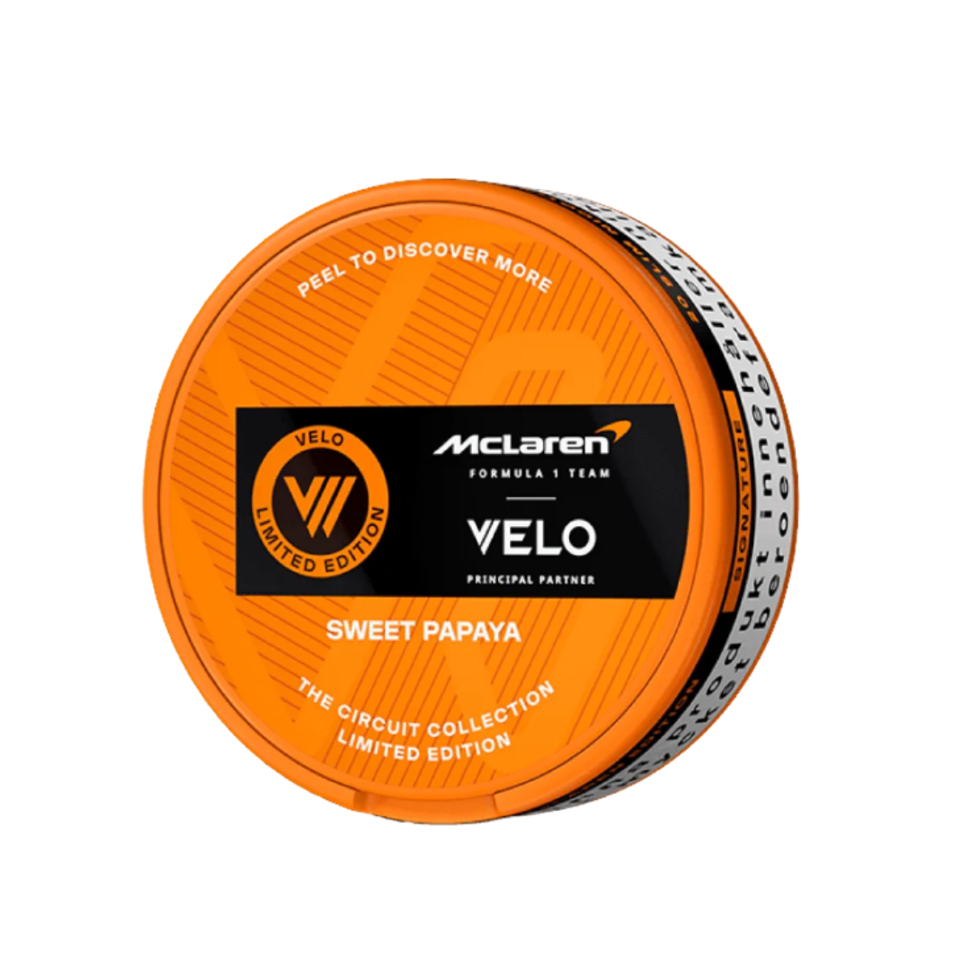 VELO McLaren Sweet Papaya is a white pouch product from manufacturer BAT, presented in a slim format. Developed in collaboration with McLaren and launched as a limited edition, it delivers a smooth, exotic papaya flavor in a sleek and discreet pouch design.